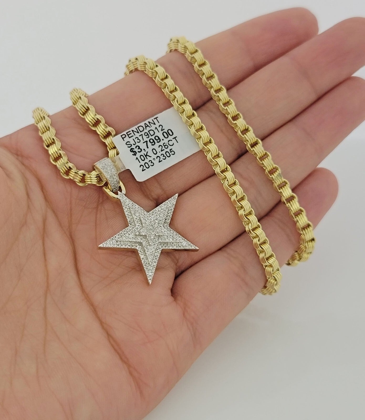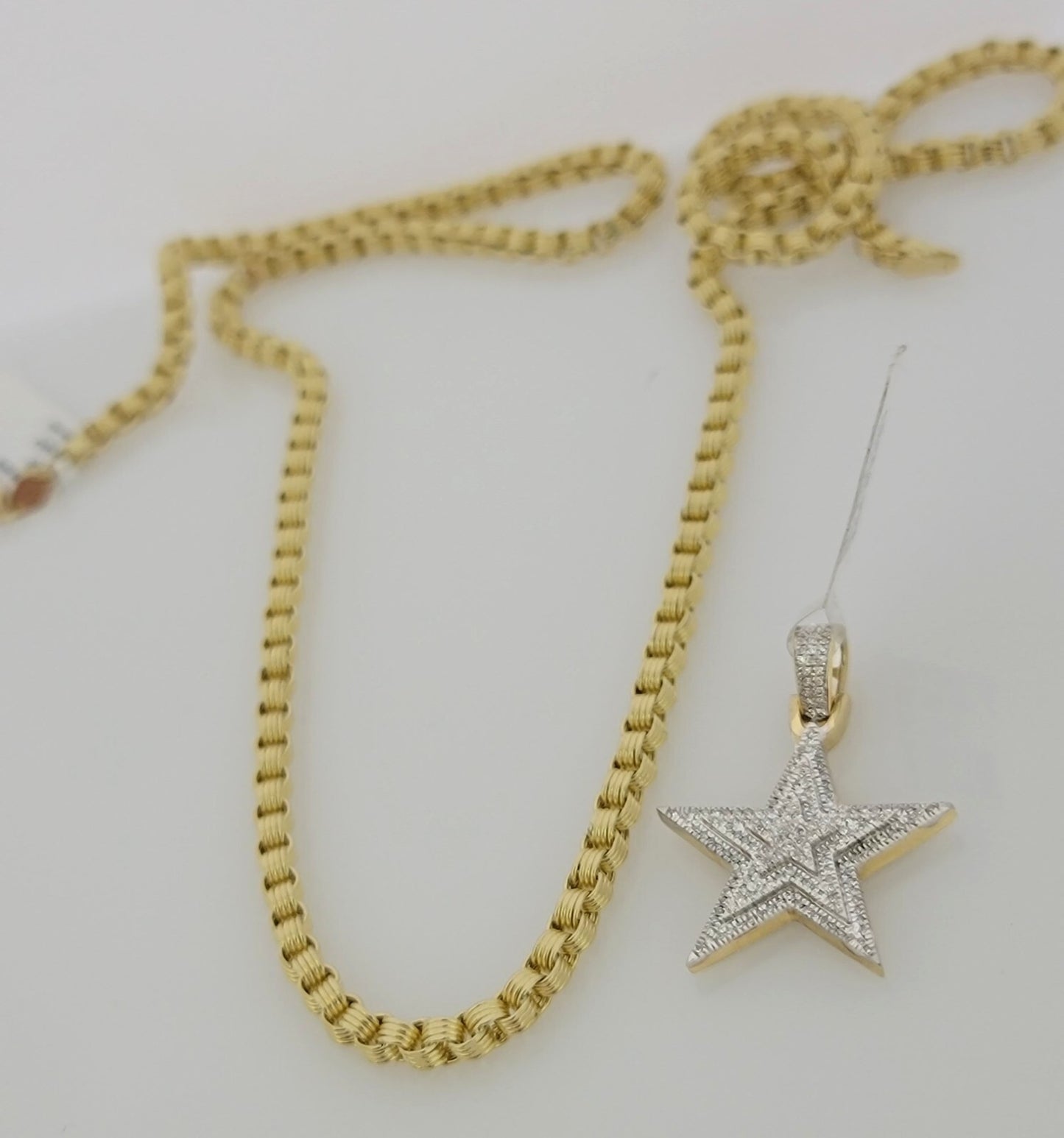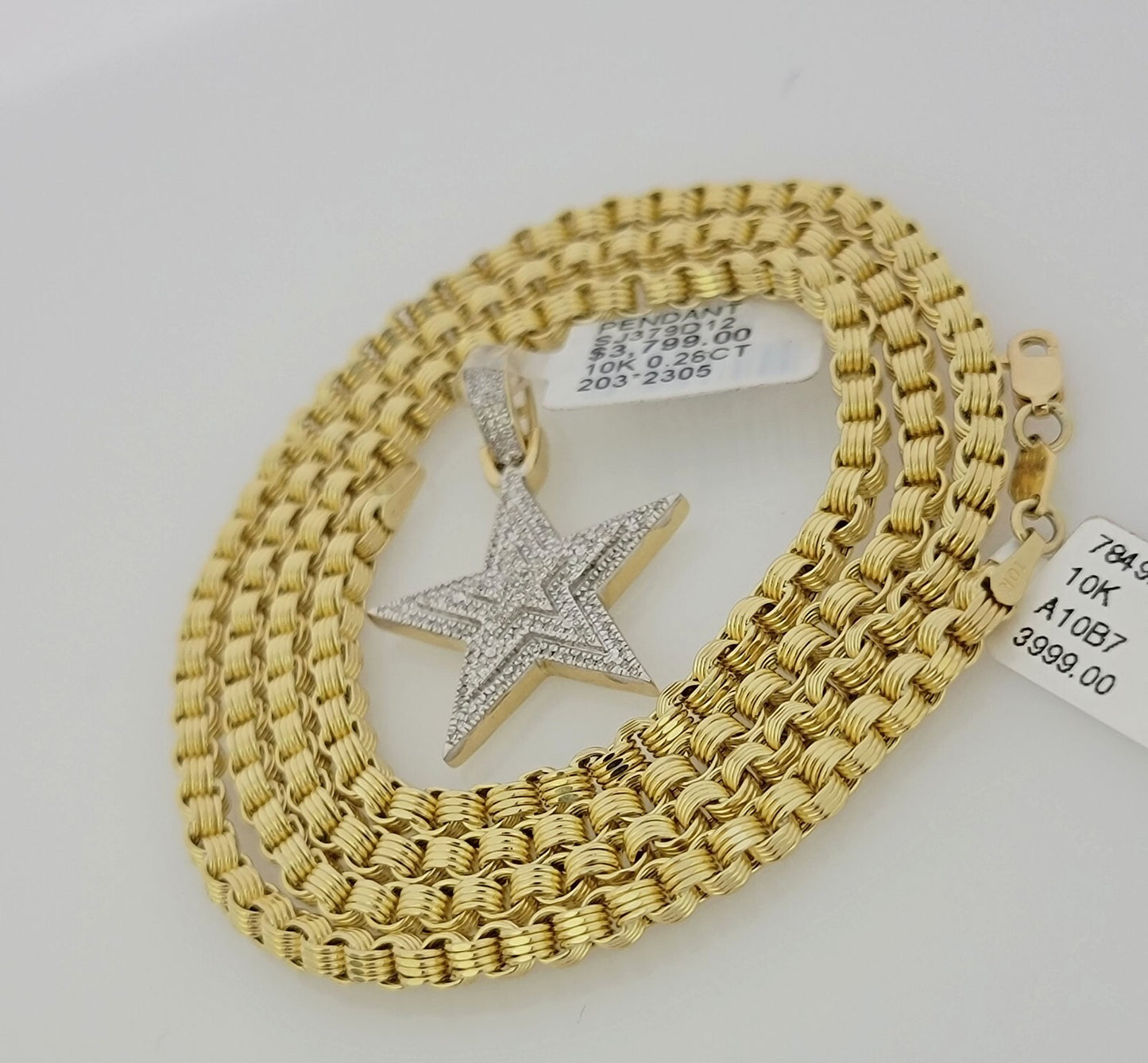 Real 10K Yellow Gold byzantine Chain With Star Charm Pendant SET