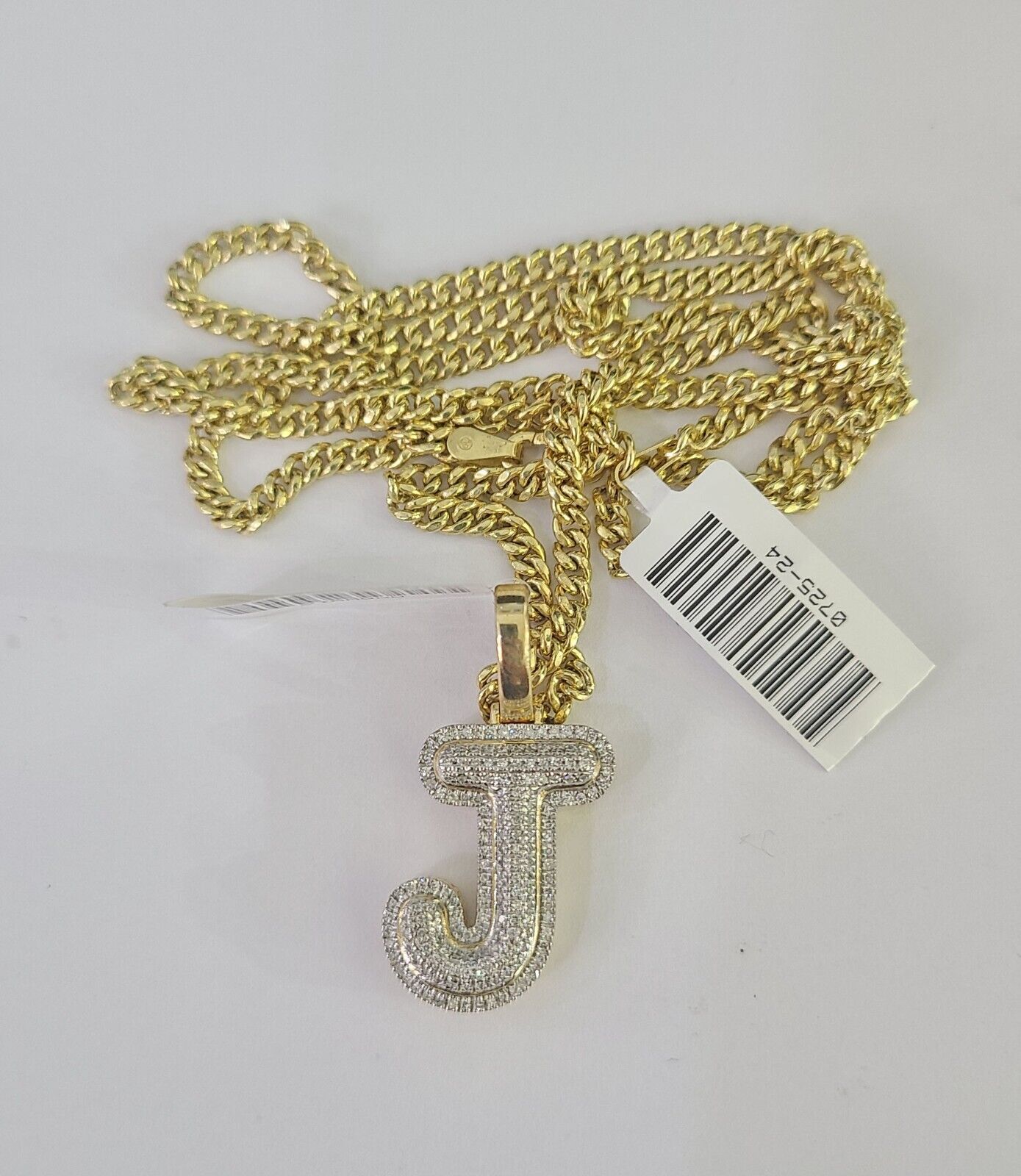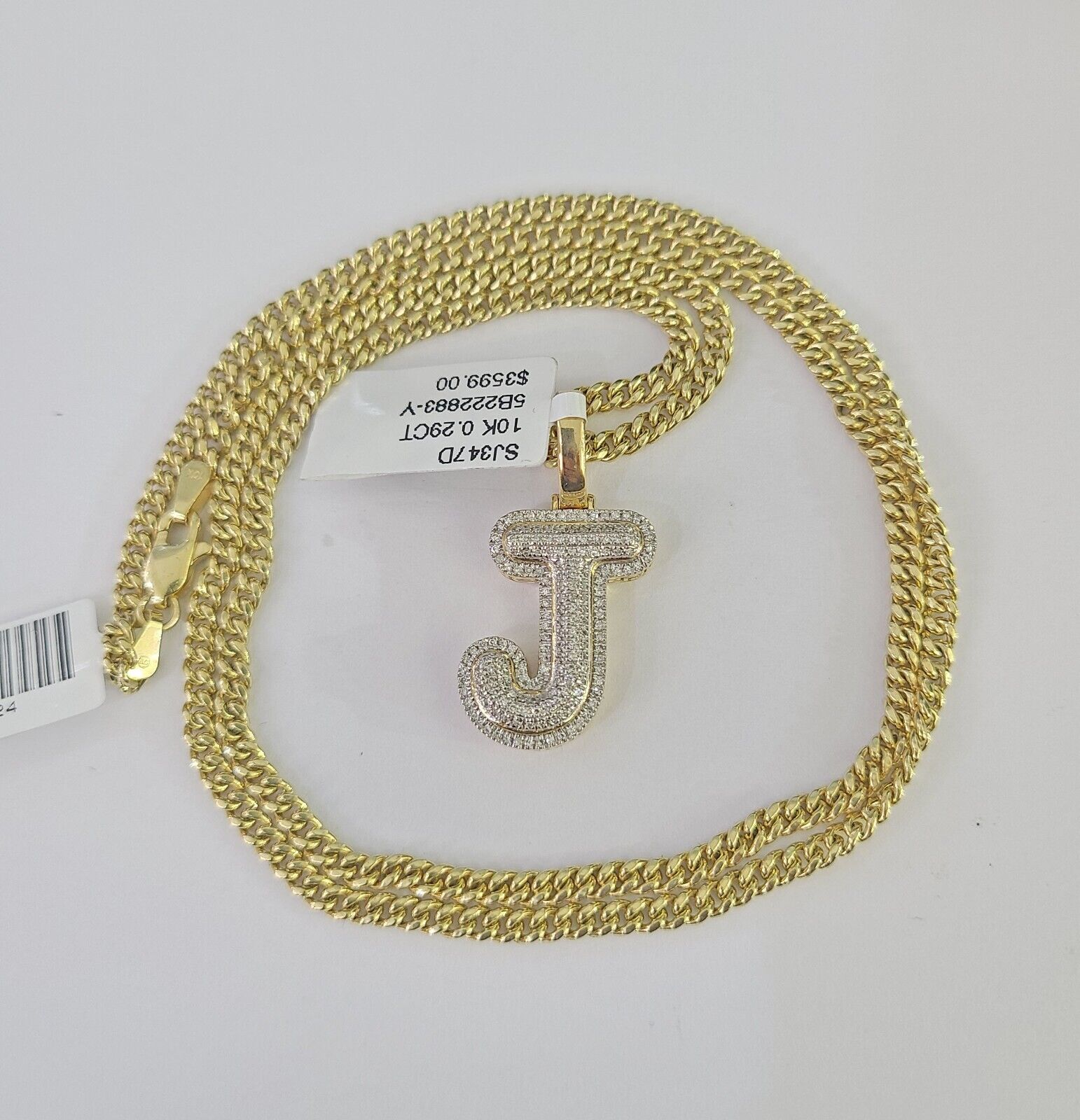 Real 10k Gold Chain J Alphabet Charm Pendant SET 3mm Miami Cuban Link Necklace