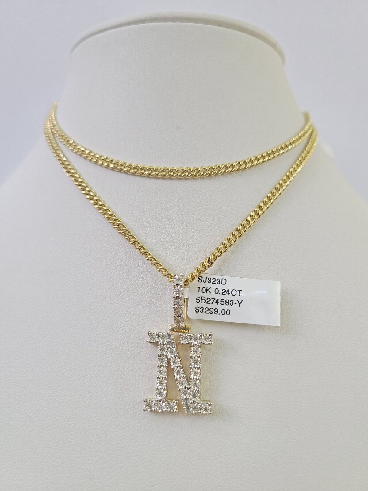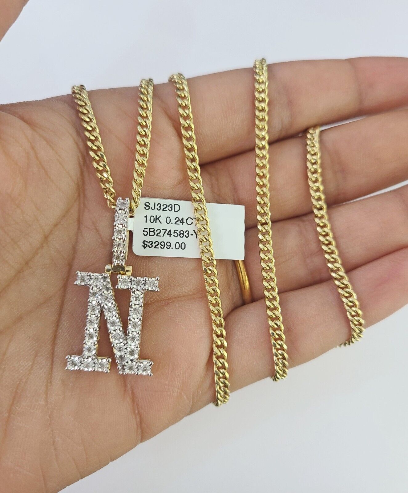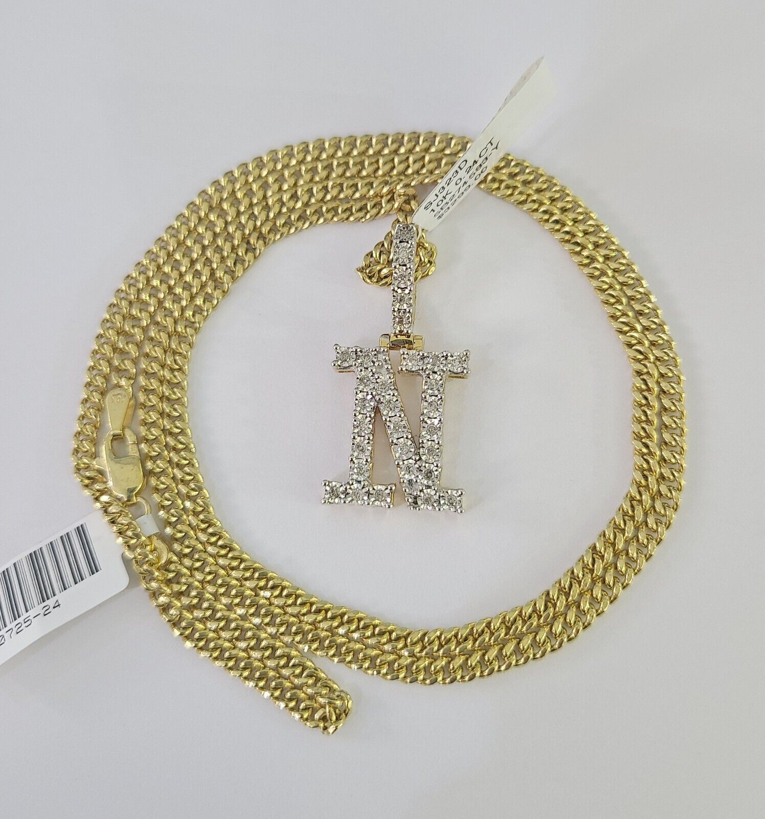 Real 10k Gold Chain N Alphabet Charm Pendant SET 3mm Miami Cuban Link Necklace