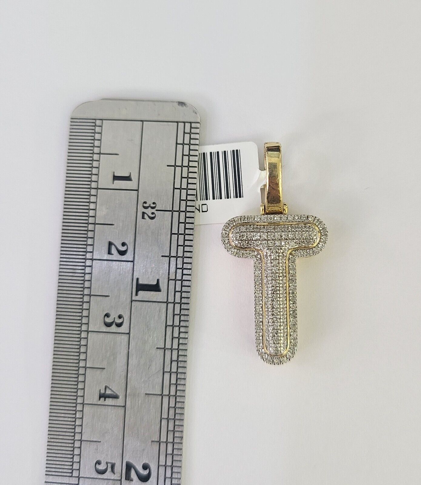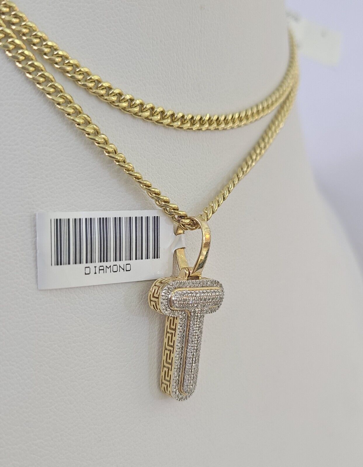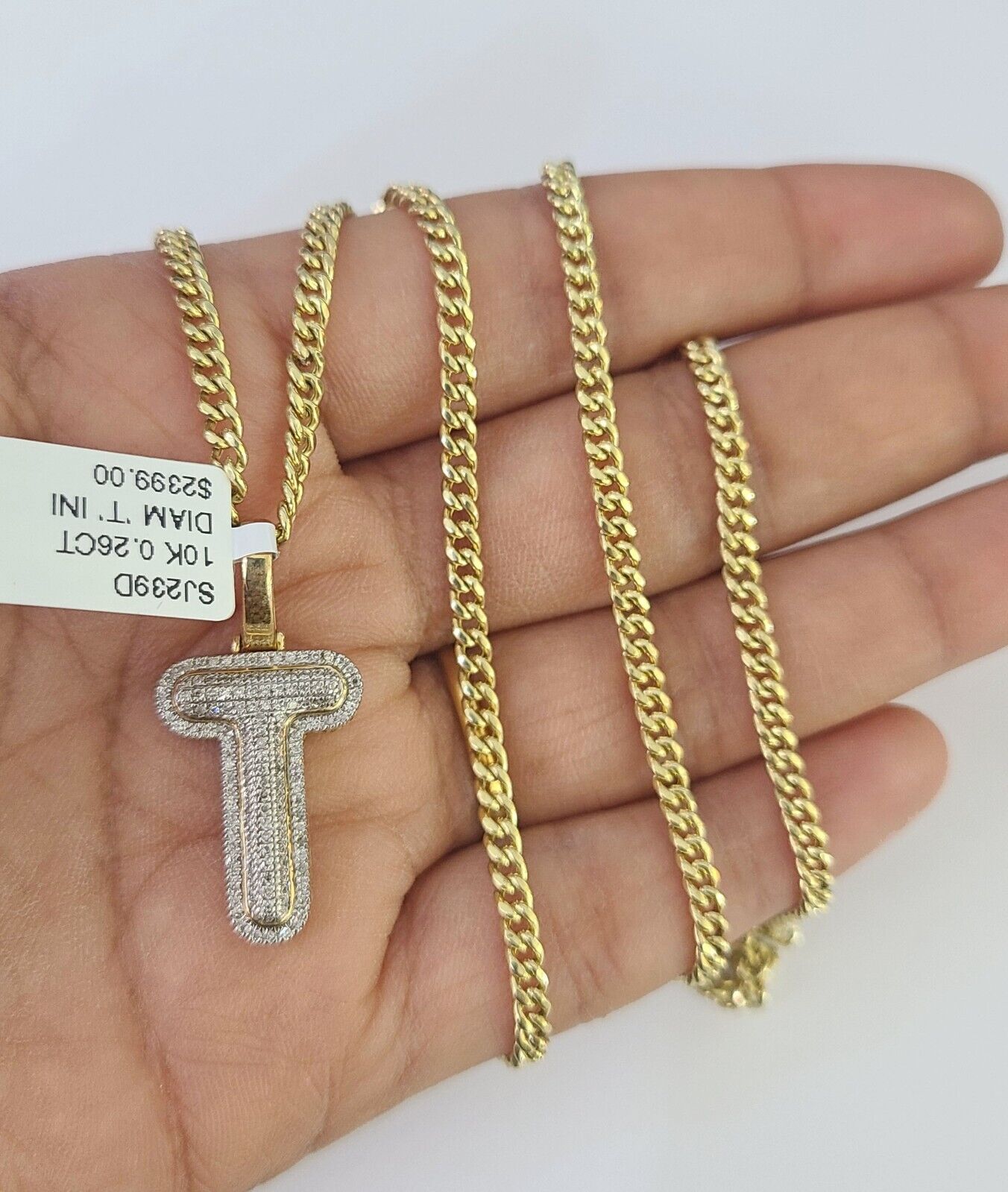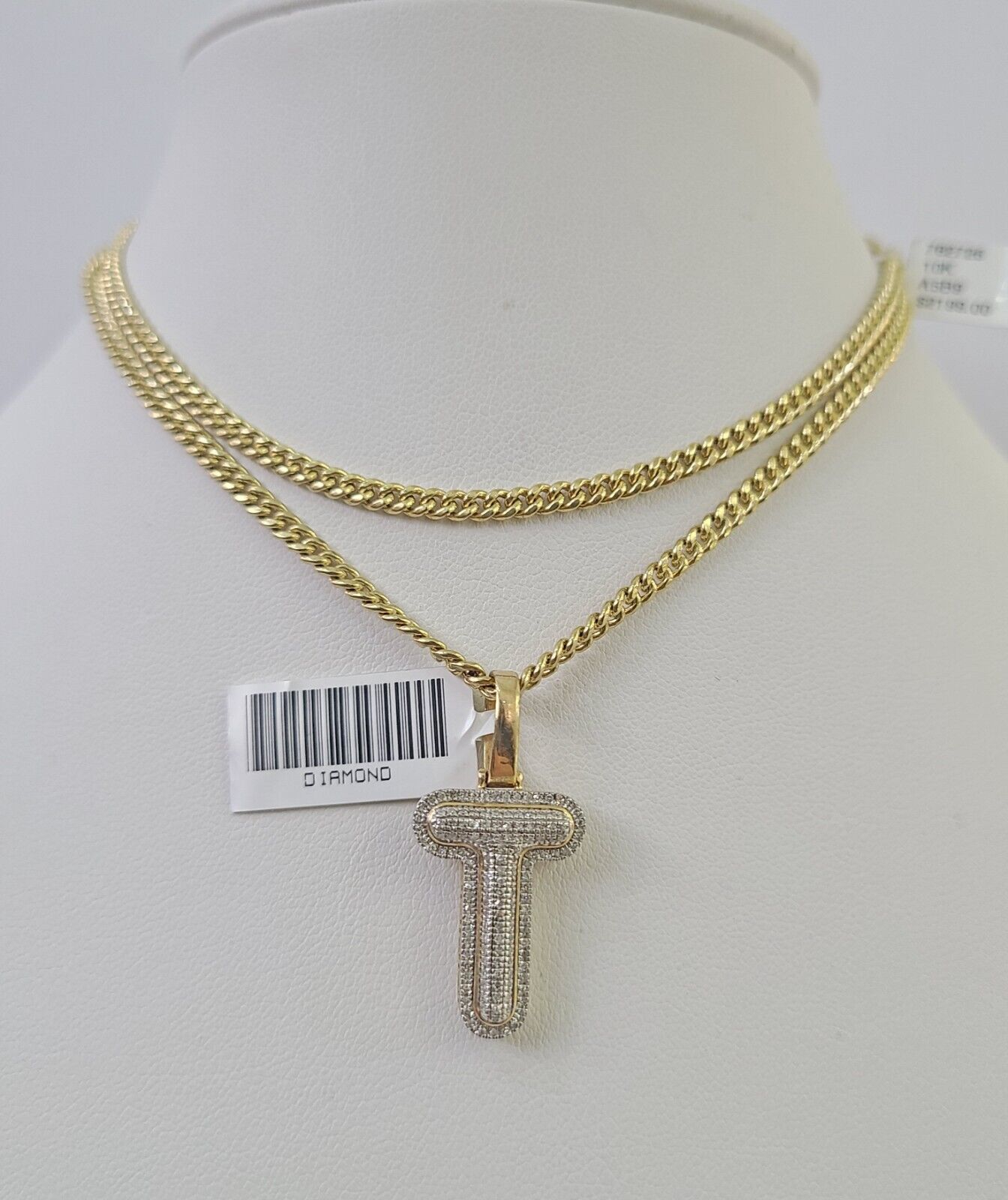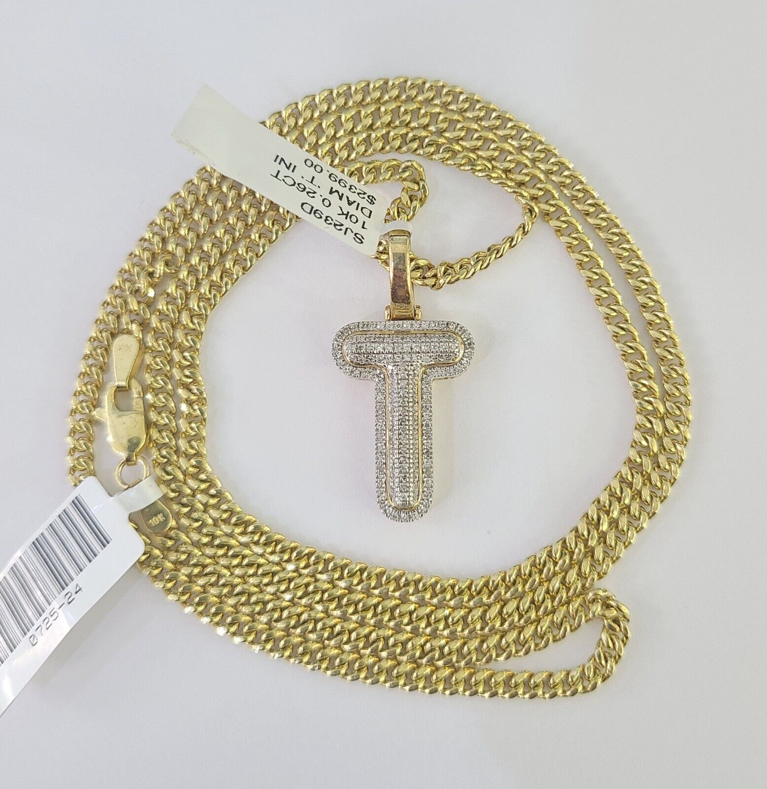 Real 10k Gold Chain T Alphabet Charm Pendant SET 3mm Miami Cuban Link Necklace