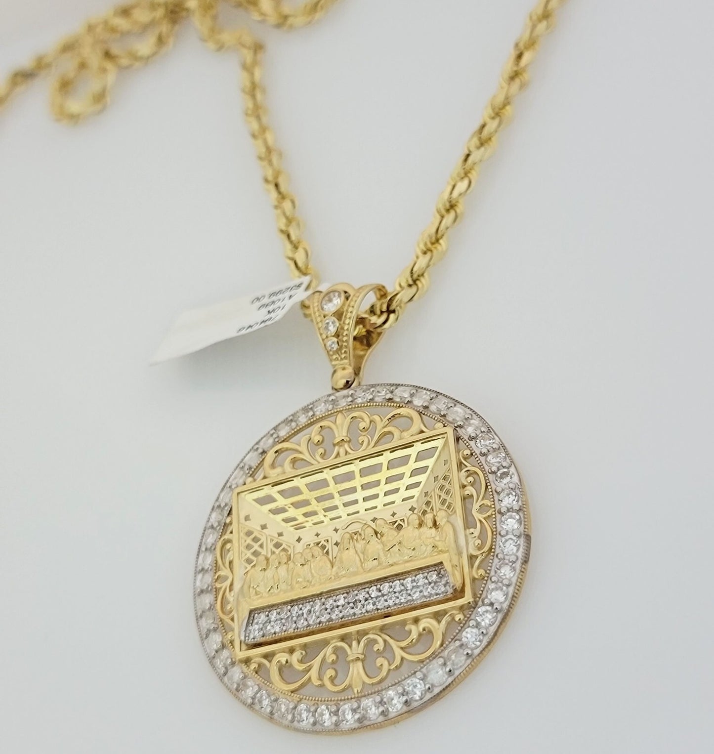Real 10k Gold Rope chain Last supper Charm Pendant SET Solid Necklace 4mm 22Inch