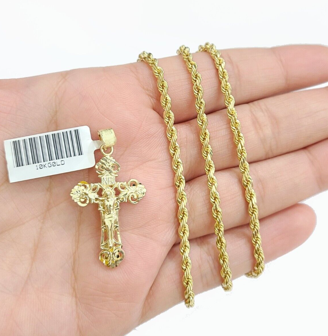 Real 10k Yellow Gold Jesus Cross Charm Rope Chain Necklace 3mm 22'' Pendant 10kt