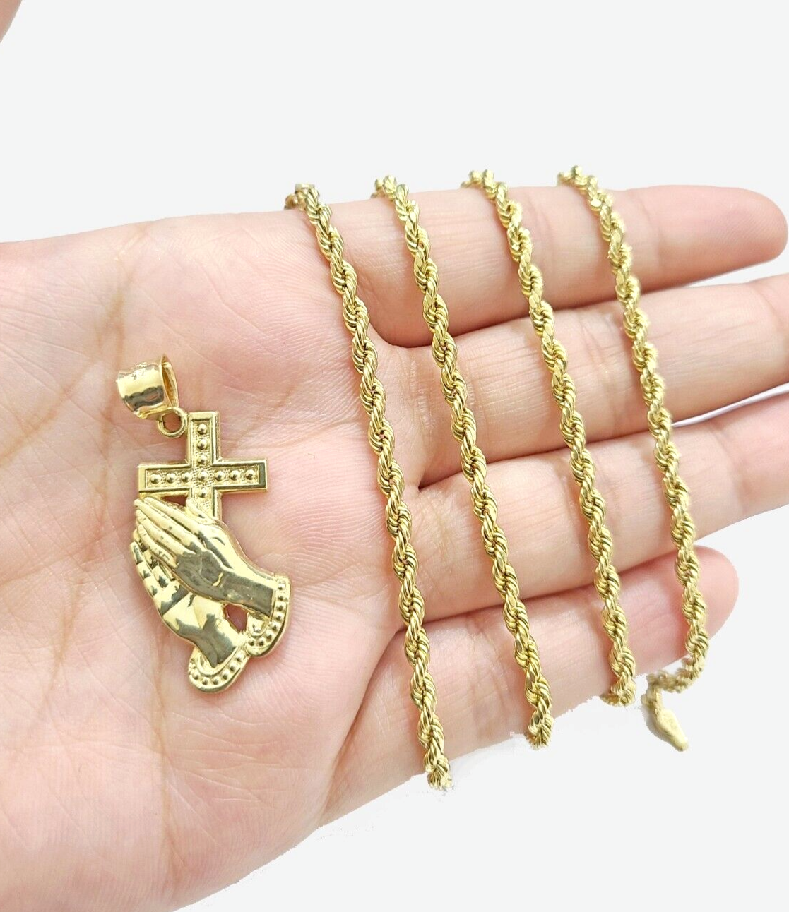 Real 10k Yellow Gold Rope Chain 18'' Necklace Praying Hand Cross Charm Pendant